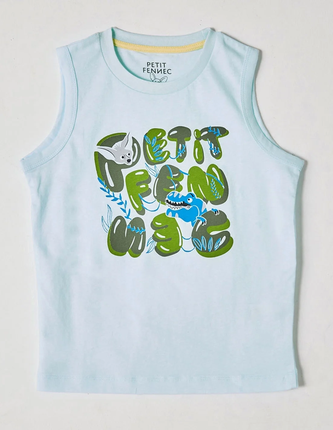 Disponible en Bleu Clair et Jaune Clair, ce débardeur 100% coton met en scène notre Petit Fennec et son ami dinosaure pour un look ludique et moderne. Fabriqué en Algérie, il allie confort et résistance. Idéal avec un bermuda pour un style décontracté ou un pantalon pour plus d'élégance.