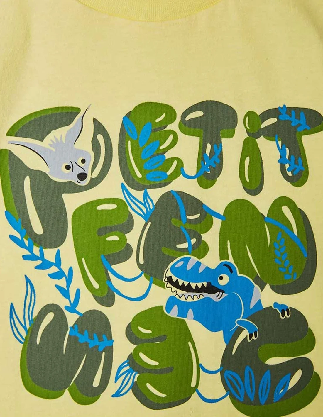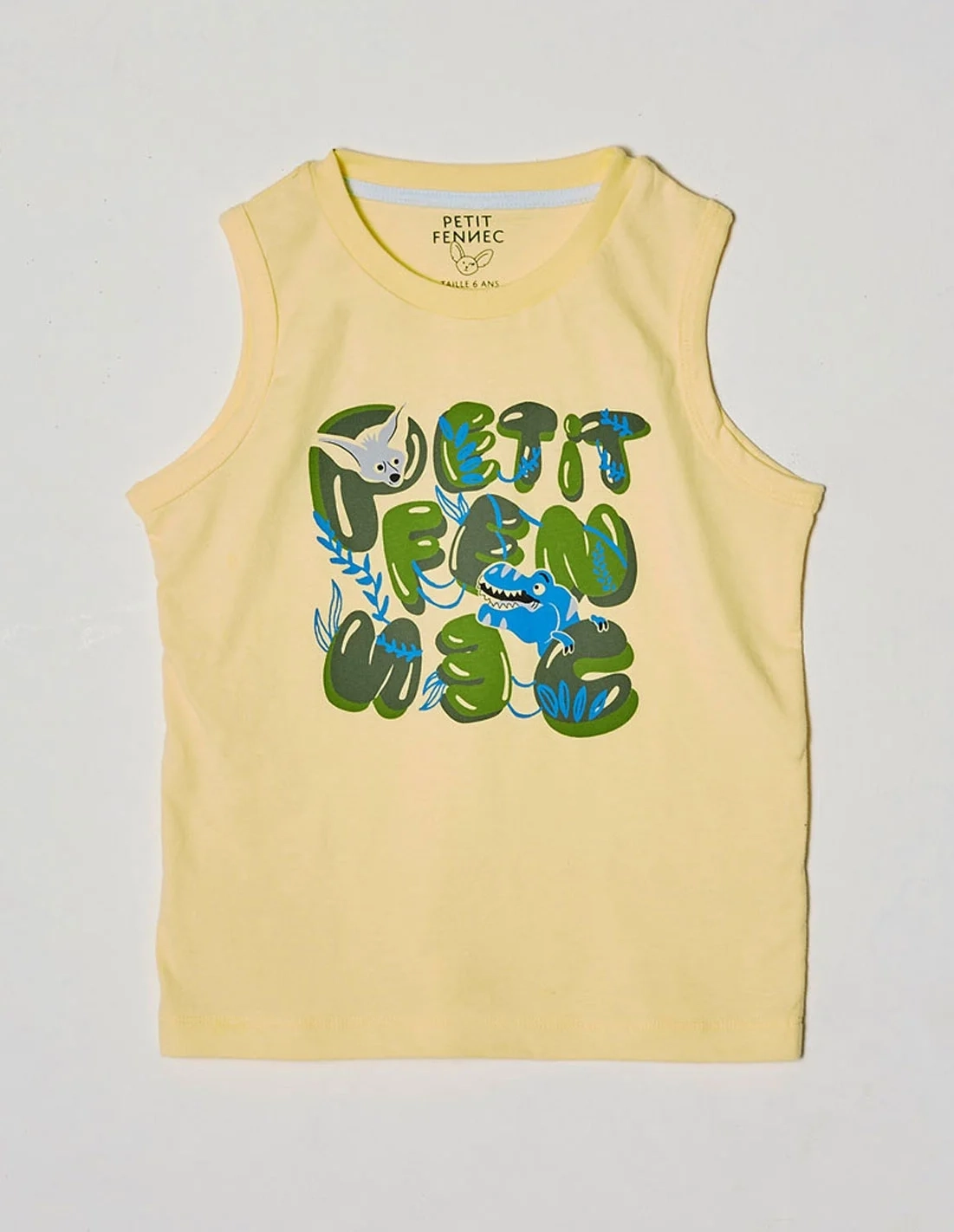 Disponible en Bleu Clair et Jaune Clair, ce débardeur 100% coton met en scène notre Petit Fennec et son ami dinosaure pour un look ludique et moderne. Fabriqué en Algérie, il allie confort et résistance. Idéal avec un bermuda pour un style décontracté ou un pantalon pour plus d'élégance.
